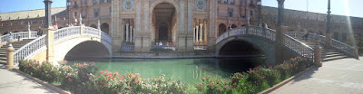 La temperatura è più alta rispetto a quanto immaginavo.Nelpunto più alto del sole, circa la una di pomeriggio si toccano quasi i 38 gradi e la sensazione che si sente camminando  è come se due mani ti schiacciano verso il suolo costantemente.Qui il sole è propio pesante nel senso che pesa sulla testa sul corpo...Ovviamente sono sensazioni che si fanno via via accentuando complice il fatto che non sono abituato al sole di queste latitudini, diverse per tutto dal nord italia.Finalmente dopo un paio d'ore si intravedono dei muraglioni di fichi d india che delimitano come recinzione un campo verde di arance, ovviamente irrigato;tutti presagi di un prossimo paese.Di lì a poco infatti si entra a Guillena, sonno le 16 circa e la gente vista la temperatura non esce di casa, e la sensazione che si ha è quella di una città del far west..il nulla per le strade.Bisogna attraversare tutto i paese per poi scendere fino al centro sportivo dove si trova l albergue municipale.Attualmente è chiuso , ma un cartello sulla entrata dice di chiamare al telefono l ospitalera che viene ad aprire.Chiamo ma bisogna aspettare fin verso le 6, quindi armato di buona lena lascio lo zaino in una stanza come suggerito dall ospitalera e risalgo la salita che in precedenza mi ha portato qui, per trovare un bar dove bere la mia meritata cerveça.